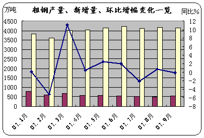 據(jù)國際鋼協(xié)統(tǒng)計,9月份******67國粗鋼產(chǎn)量為1.101億噸,較去年同月增長6.2%。2007年1-9月份,亞洲粗鋼產(chǎn)量為5.408億噸,較去年同期增長11.7%。9月份,中國粗鋼產(chǎn)量為4153萬噸,較去年同月增長14.8%。